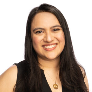 Grace Asenjo is standing outside, wearing a grey cardigan and a red necklace for her headshot photo