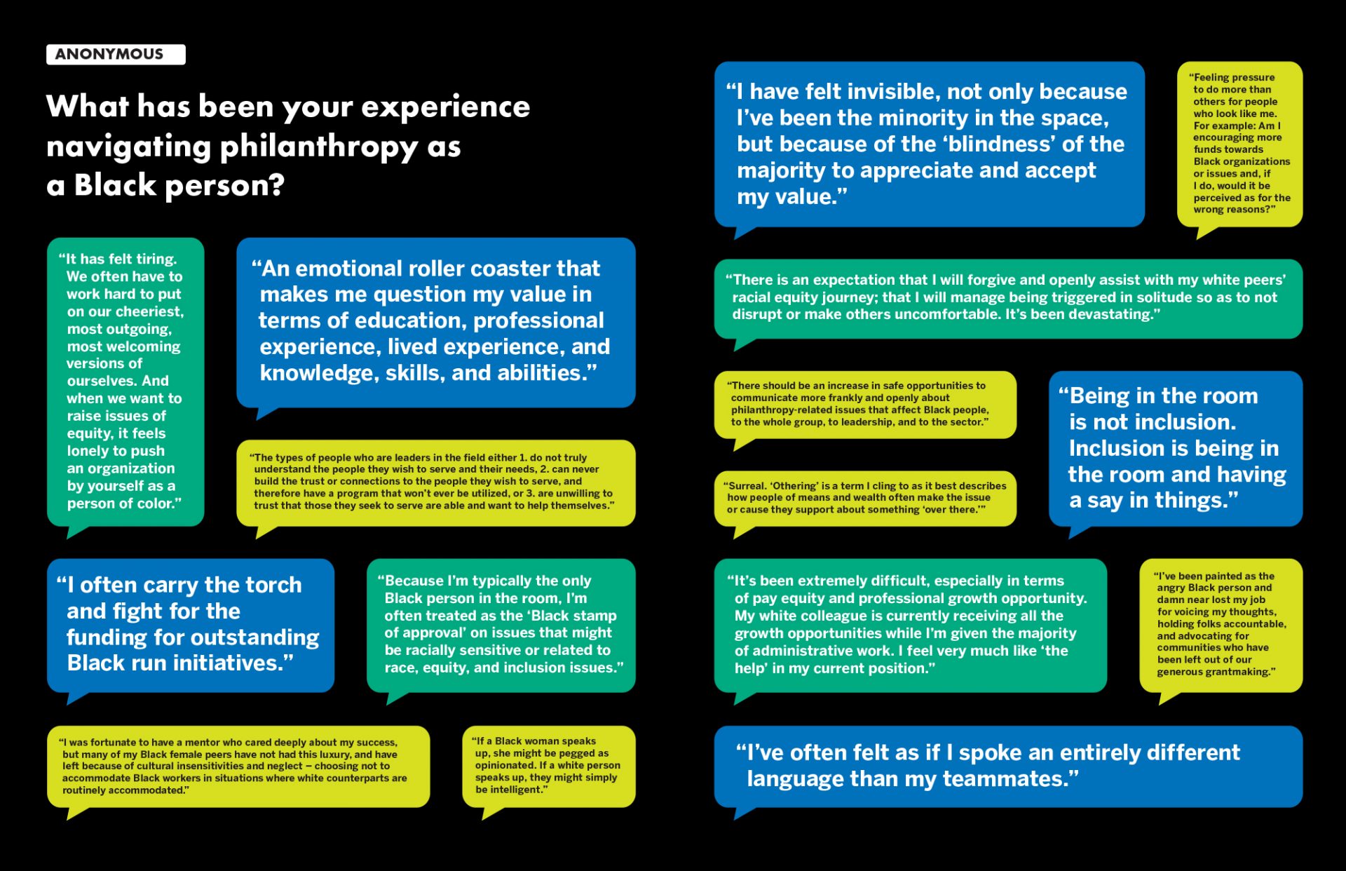 Click here to hear the voices of dozens of Black grants professionals speaking up about their experiences in philanthropy.