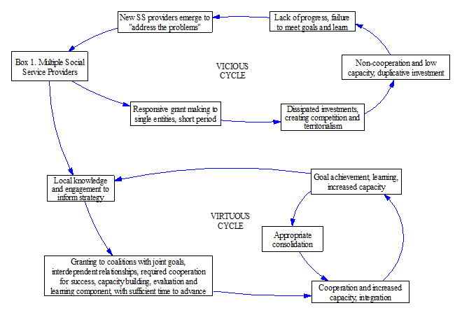 Let’s take the same starting point below—Box 1’s multiple social service providers—and consider how a strategic philanthropy approach might transform a vicious cycle into a virtuous cycle for community health. Instead of the purely responsive grant-making described above, let’s say the philanthropy discovers that there are many local social service agencies with a similar focus, being funded by multiple donors, creating little incentive to work together.