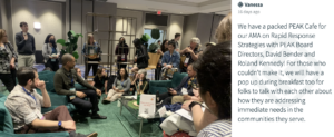 From left: Jessica Bearman shared takeaways from a group conversation. Vanessa shared a snapshot of the Ask Me Anything session on rapid response in the PEAK Café.