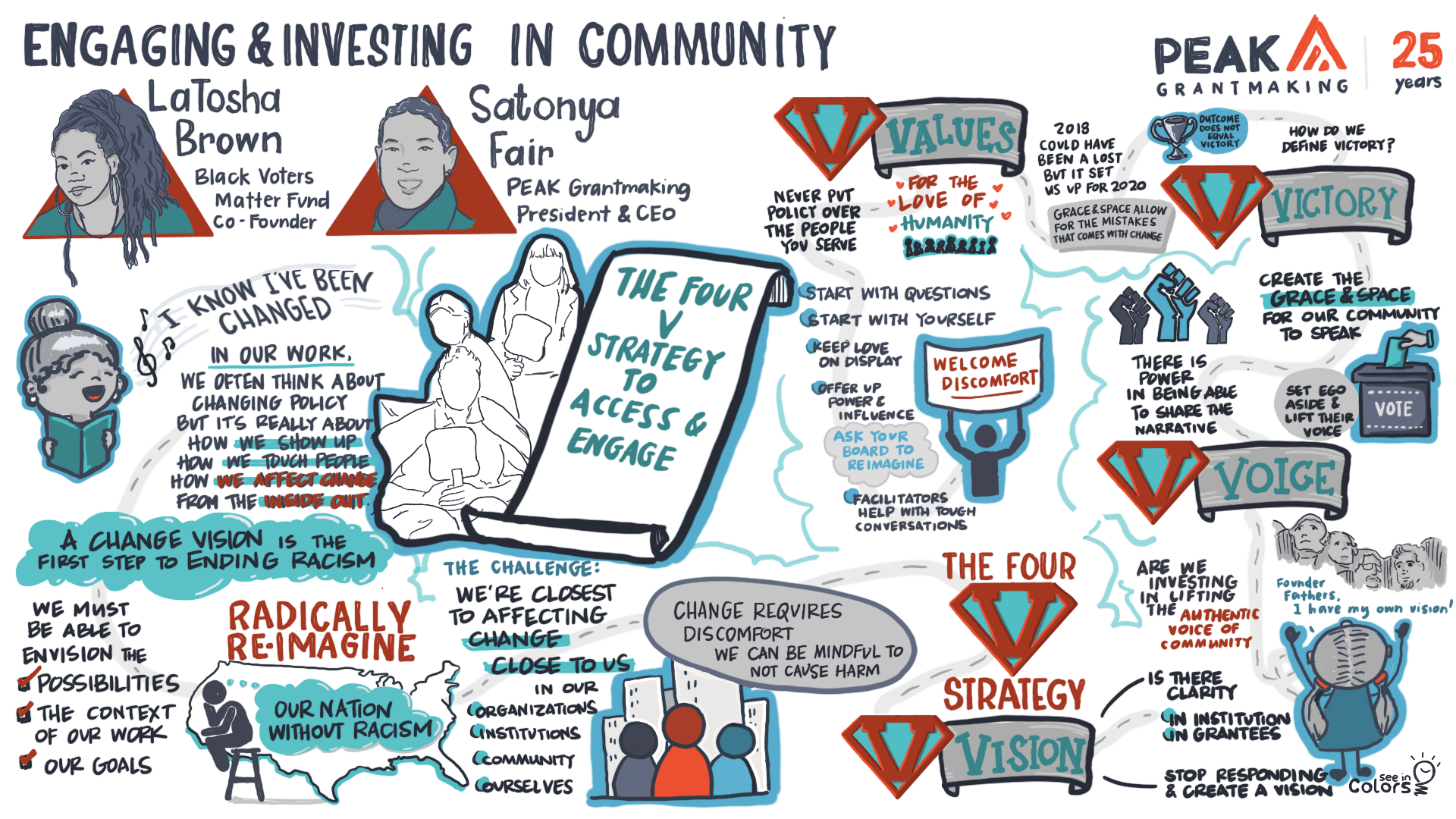 In her riveting opening keynote for PEAK2021, Black Voters Matter founder LaTosha Brown asked the audience to consider what possibilities would exist if racism was eliminated, urging everyone to claim and use their power and influence to build a movement for equitable practice within the organizations we serve. In order to make this happen, funders need to invest in change, lean in to difficult conversations, and radically reimagine the systems and structures that underpin our society. “Philanthropy, you have an opportunity,” Brown said. “This is our moment. We don’t have to be transactional or continue the way we’ve been continuing. Part of the paradigm of change is changing ourselves.”